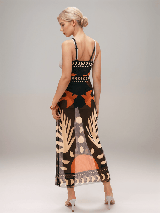 2-Piece Midi Dress Set | Sleeveless Leaf Print Dress with Sheer Drape Overlay
