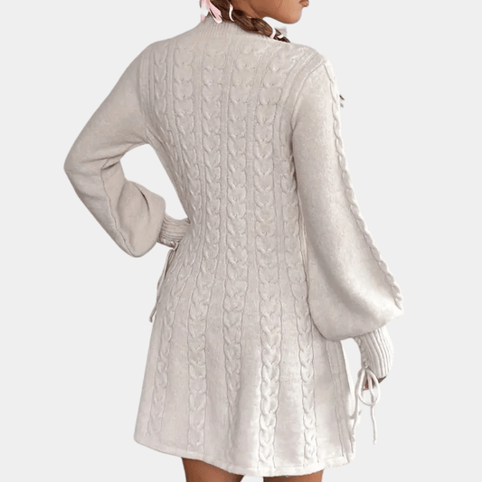 Cable-Knit Sweater Dress | V-Neckline | Flared Mini with Balloon Sleeves