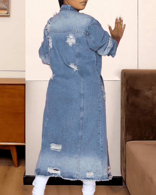 Distressed Long Denim Jacket | Button-Down | Casual Streetwear