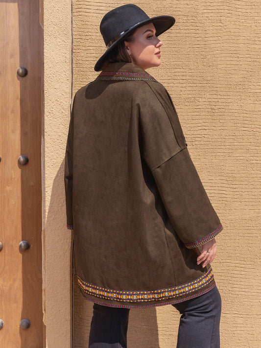 Boho-Inspired Faux Suede Coat | Sherpa Lining | Embroidered Hem | Cozy Winter Style
