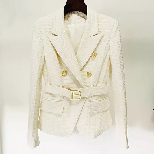 Textured Tweed Blazer | Gold Button Accents | Belted Waist | Tailored Elegance