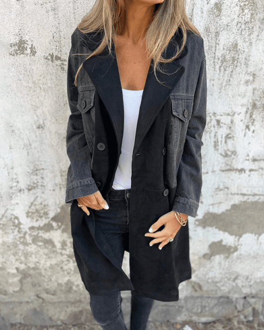 Mixed-Fabric Trench Coat | Denim and Suede-Look Contrast with Button Front