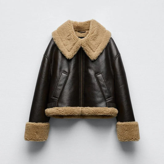 Women's Aviator Jacket | Brown PU Leather with Shearling Trim | Cozy Winter Style