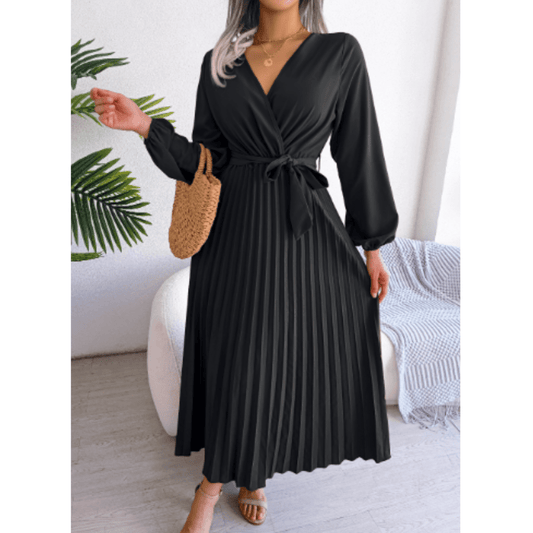Pleated V-Neck Maxi Dress | Self-Tie Waist | Elegant Long Sleeve Design
