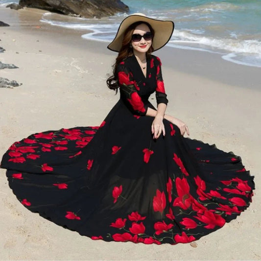 Rose Print Maxi Dress | Elegant Floral Design | Lightweight Chiffon | Statement Evening Wear