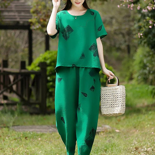 Relaxed Fit Two-Piece Set | Lightweight Crinkled Texture & Abstract Leaf Print