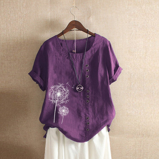 Floral Linen-Blend Short Sleeve Blouse | Casual Summer Top with Side Buttons