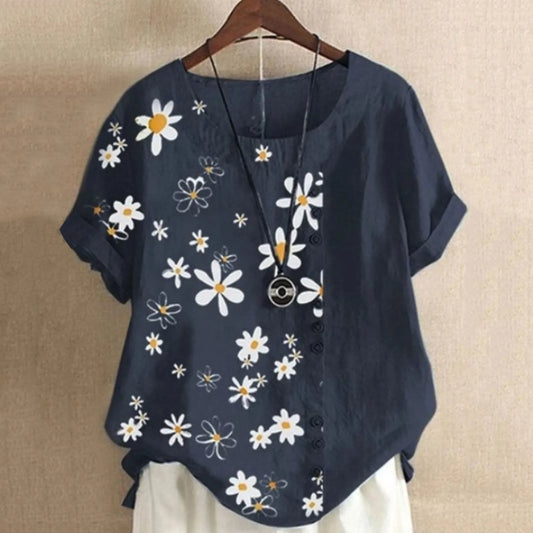 Floral Button Detail Linen Top | Short Sleeve Summer Blouse | Relaxed Fit