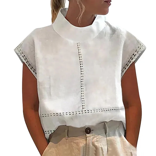 Sleeveless Linen Blend Blouse | Crochet Trim Mock Neck | Lightweight Summer Top