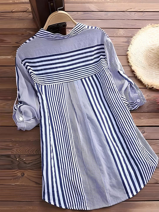Striped Button-Up Blouse | Mixed Stripe Pattern | Lightweight Everyday Shirt
