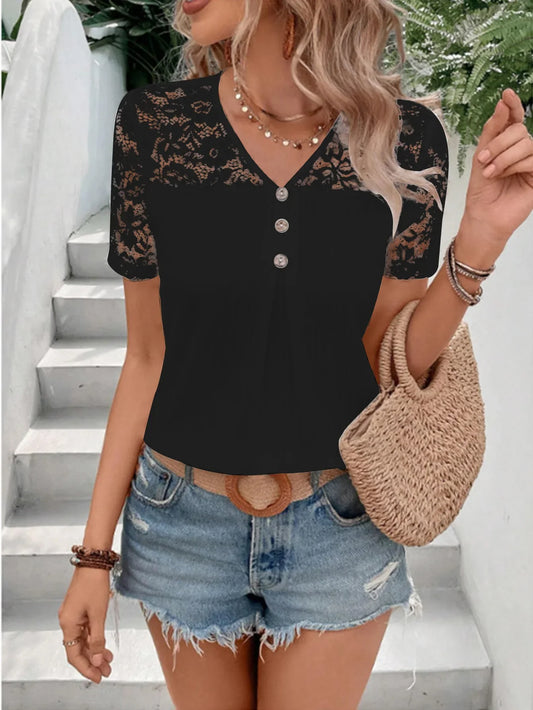 Lace Yoke Summer Blouse | Button Front Detail | Lightweight V-Neck Top
