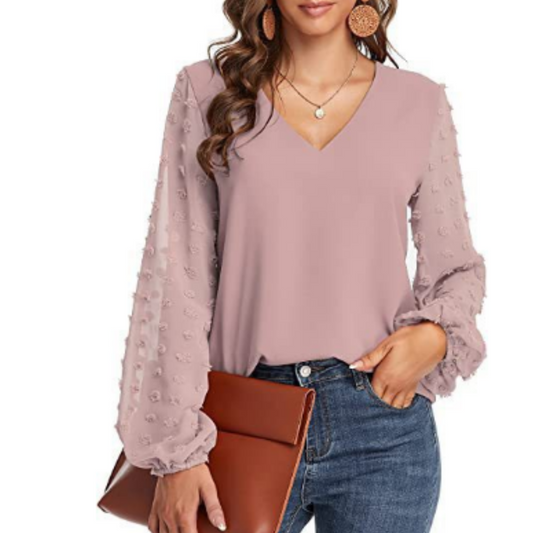 V-Neck Chiffon Blouse | Swiss Dot Sleeves with Ruffle Cuffs | Elegant Fall Top