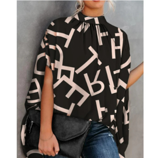Women's High-Neck Printed Blouse | Loose Fit Cape Sleeve Top | Casual Statement Shirt
