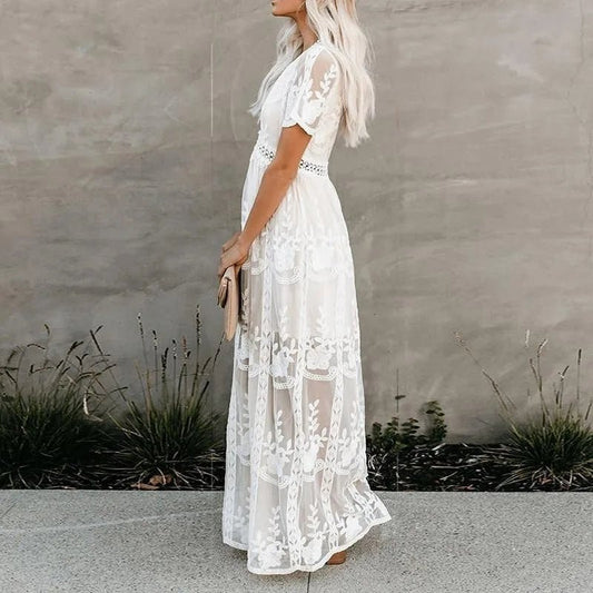Embroidered Lace Maxi Dress | Bohemian Elegance | Sheer Overlay