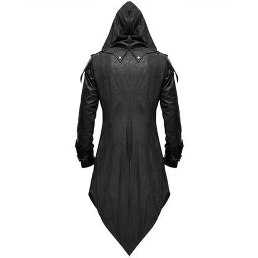 Men’s Long Hooded Gothic Trench Coat | Faux Leather | Buckle Detail | Statement Outerwear
