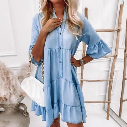 Tiered Denim-Style Mini Dress | Button-Front with 3/4 Sleeves | Lightweight Casual Fit