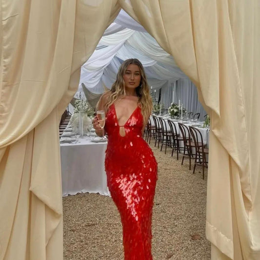 Sequin Gown | Deep V-Neck & Bodycon Fit | Red Evening Dress with Keyhole Detail