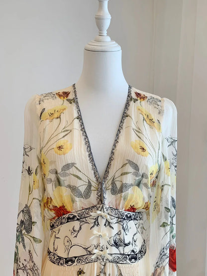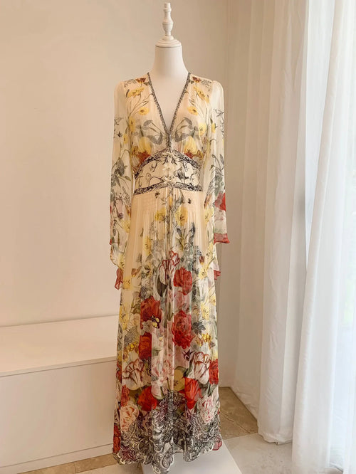 Capture effortless bohemian elegance with this stunning floral maxi dress. Featuring a deep V-neckline adorned with playful tassel accents, this dress combines relaxed sophistication with artistic flair. The flowing silhouette and lightweight fabric make it perfect for warm-weather occasions, whether you’re strolling through a resort or attending a summer soirée. The vibrant floral print and long sleeves create a striking yet comfortable look that’s ideal for both daytime and evening wear.