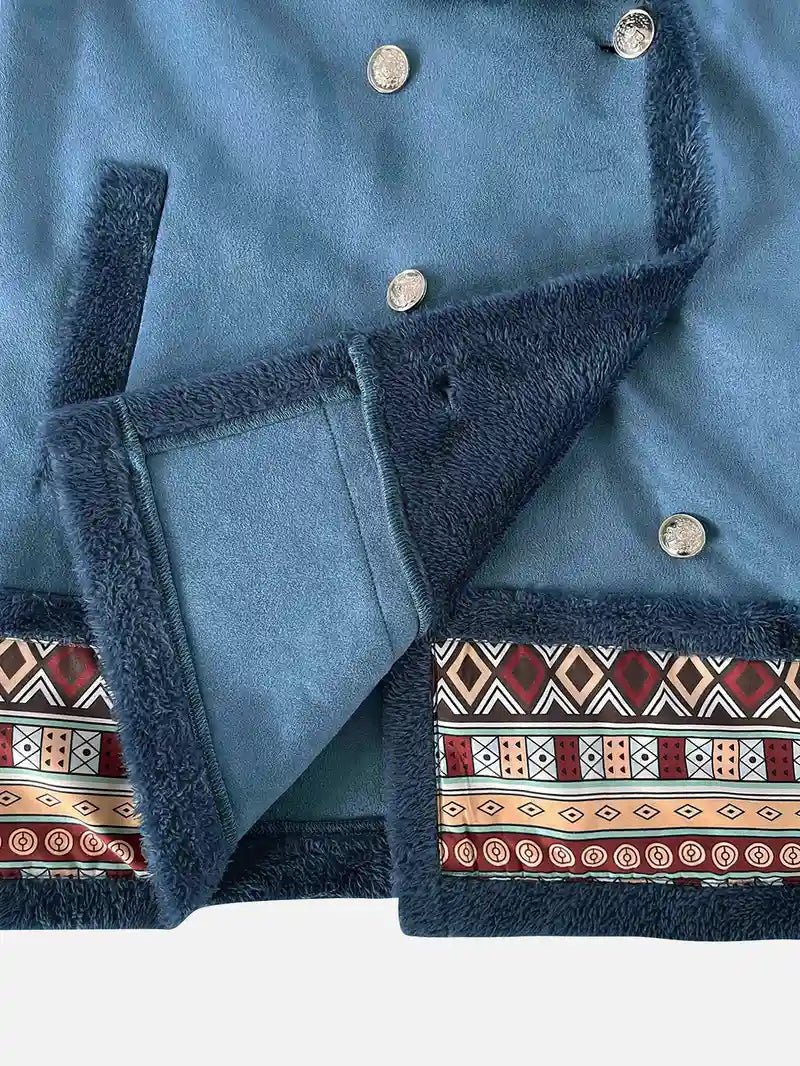 Embrace bohemian charm with this faux suede coat featuring a sherpa-lined interior and intricate embroidered details. Designed for both warmth and style, the double-breasted closure and wide shawl collar add a touch of elegance. The embroidered hem and cuffs provide a unique, artistic flair, making it the perfect winter statement piece.