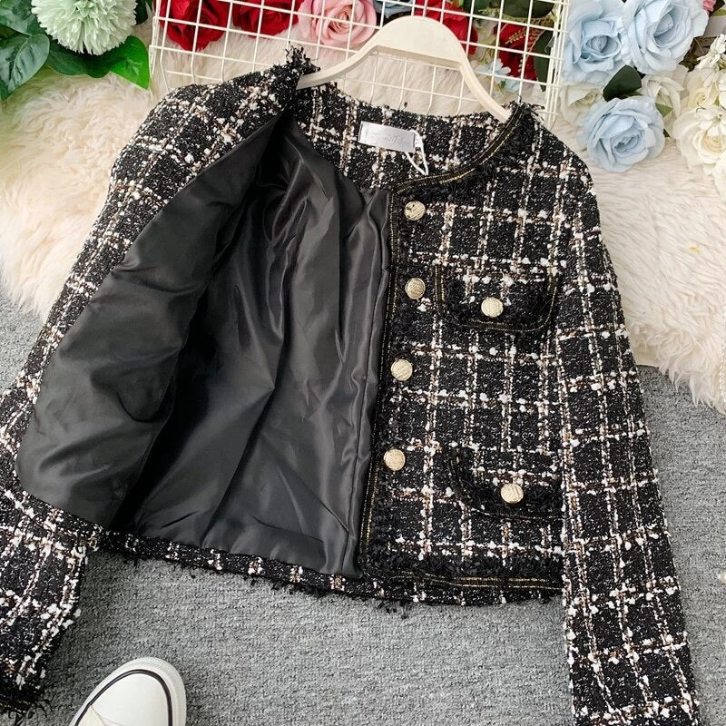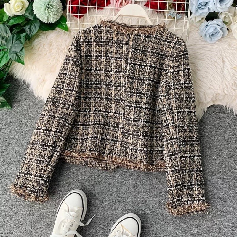 Cropped Tweed Jacket | Gold Button Accents | Classic Elegance | Sophisticated Layering