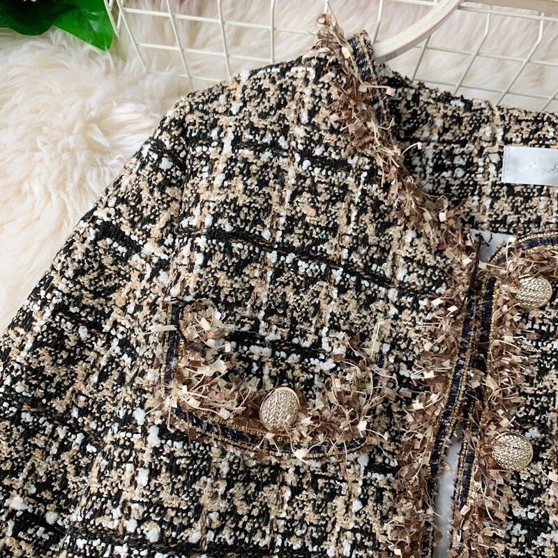 Add a touch of sophistication to your wardrobe with this cropped tweed jacket, featuring a timeless design and luxurious gold button accents. Crafted from textured tweed fabric, this piece is perfect for layering over dresses, blouses, or turtlenecks. The tailored silhouette and classic details make it a versatile choice for both casual and formal occasions.