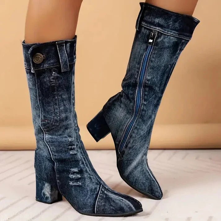 Denim Mid-Calf Boots | Distressed Style | Chunky Heel | Casual Statement