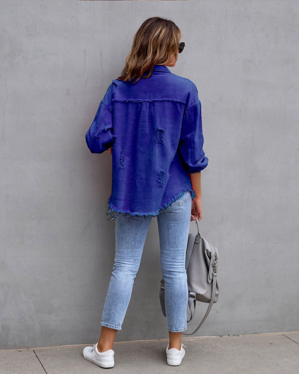 Distressed Denim Shacket | Casual Oversized Fit | Button-Up Style | Trendy Layering