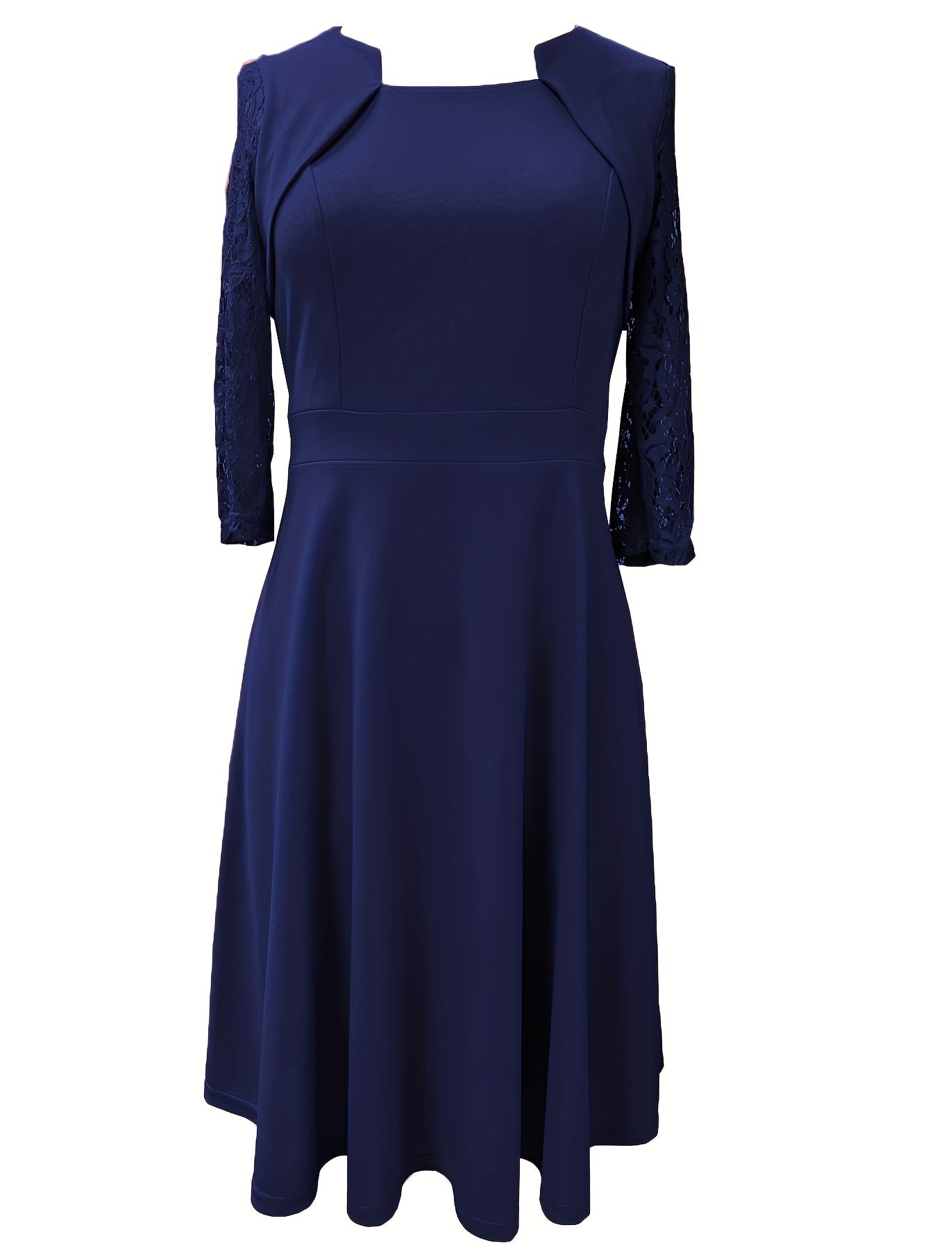 Add a touch of sophistication to your wardrobe with this elegant A-line dress, perfect for formal events, work, or evening outings. Featuring sheer lace 3/4 sleeves and a flattering square neckline, this dress combines classic design with modern charm. The A-line silhouette and knee-length hem create a timeless, figure-flattering look. Crafted from soft, stretchable fabric, this versatile piece offers both comfort and elegance for any occasion.