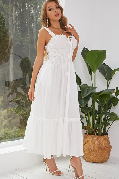 Capture timeless elegance with this tiered maxi dress, featuring a flattering fitted bodice and flowy skirt. The lightweight cotton blend ensures breathable comfort, while the adjustable spaghetti straps and subtle ruffle details add charm. Perfect for summer weddings, garden parties, or casual outings, this dress combines sophistication with effortless ease.