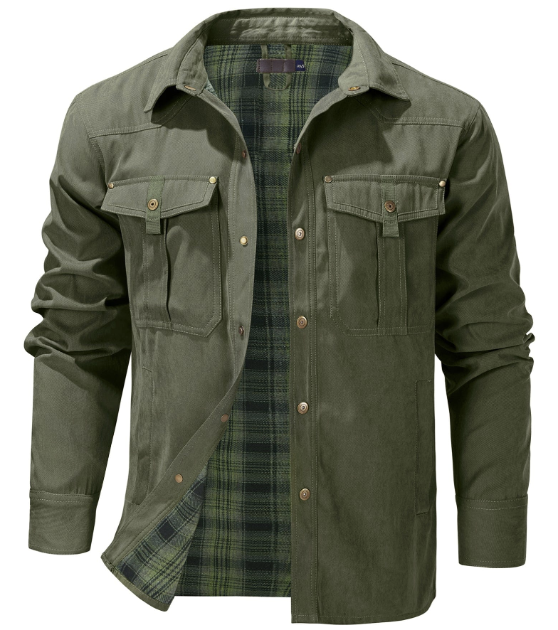 Stay comfortable in Canada’s changing weather with this versatile overshirt jacket. Featuring a durable cotton shell and warm flannel lining, it blends casual style with practical function. The button-up front and chest pockets give it a rugged workwear appeal, making it suitable for layering over tees or hoodies in spring and fall.