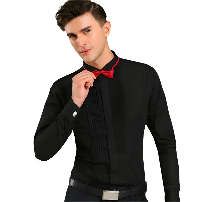 Bring refined elegance to any formal occasion with this slim fit black dress shirt paired with a detachable red bow tie. Crafted for modern Canadian events, it offers a structured yet comfortable wear with button cuffs and clean pleated detail. Perfect for galas, weddings, and upscale evenings out, this shirt ensures effortless sophistication.