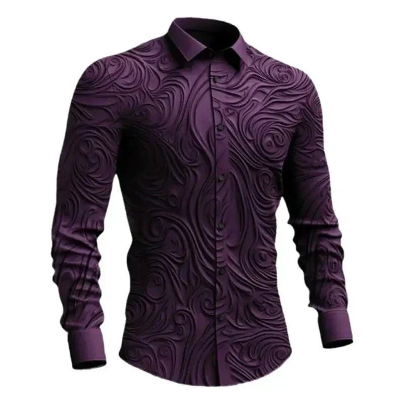 Make a bold impression with this slim-fit embossed dress shirt, ideal for formal events, nightlife, or standout businesswear in Canada. Featuring an intricate raised swirl pattern, it combines texture and structure for a visually dynamic look. Tailored with a pointed collar and button front, it balances statement style with a polished fit.