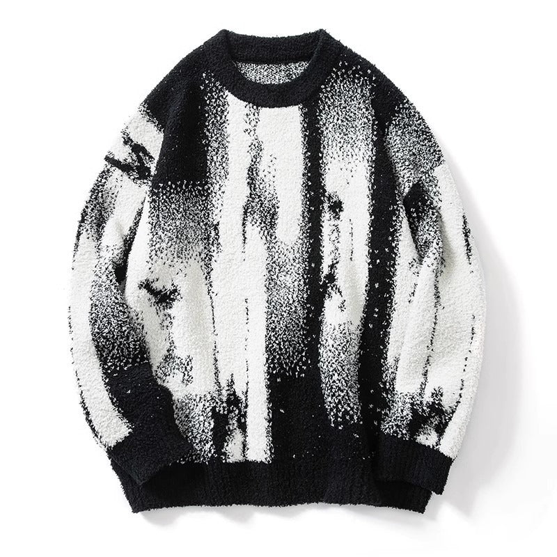 Men's Fuzzy Gradient Knit Sweater | Abstract Monochrome Pullover | Winter Streetwear