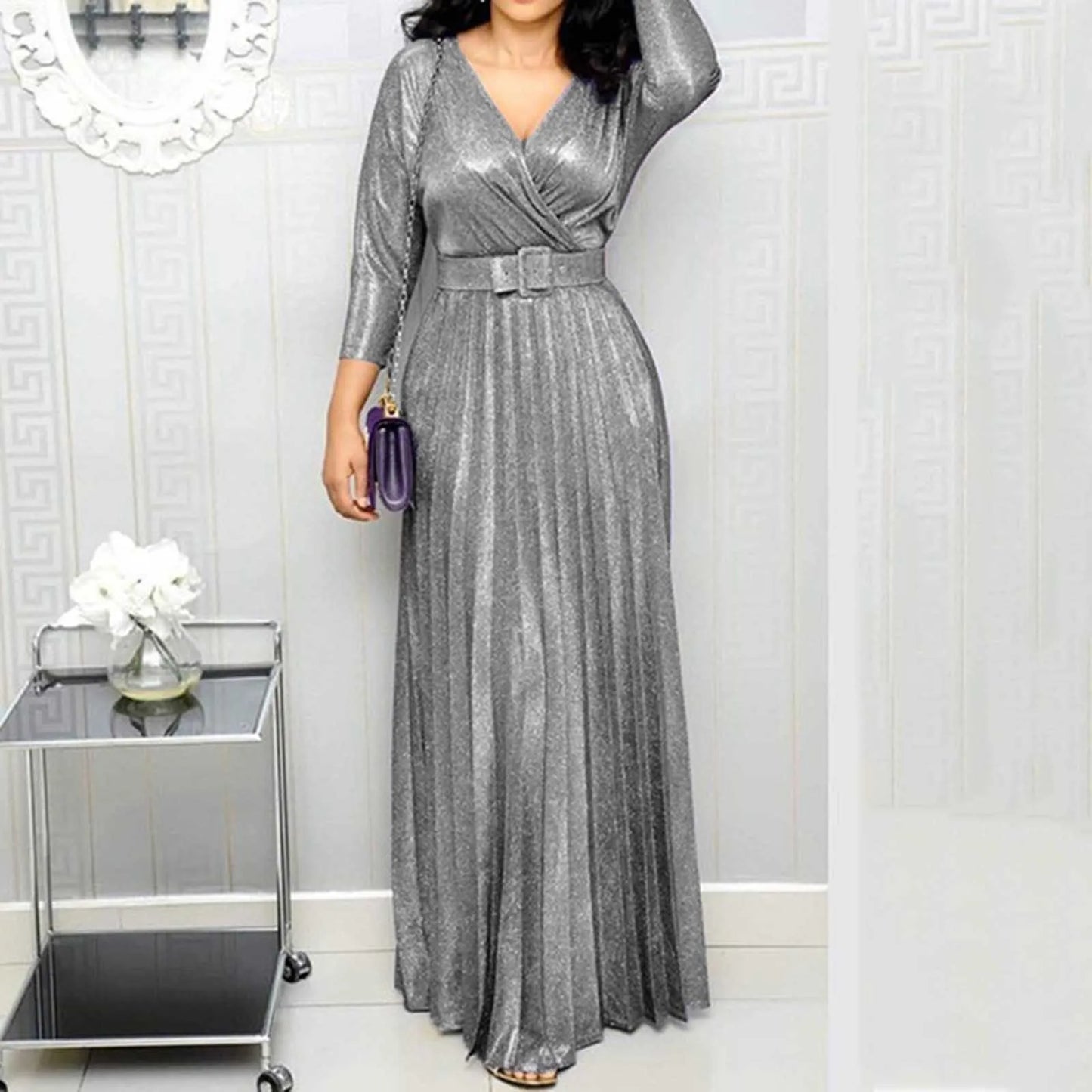 Make a glamorous entrance with this metallic wrap maxi dress, designed to shine at formal events and evening occasions. Featuring a shimmering pleated design, this dress offers a flattering wrap silhouette, V-neckline, and a belted waist to enhance your shape. The long sleeves add elegance, making it a chic choice for gala dinners, weddings, or holiday parties.
