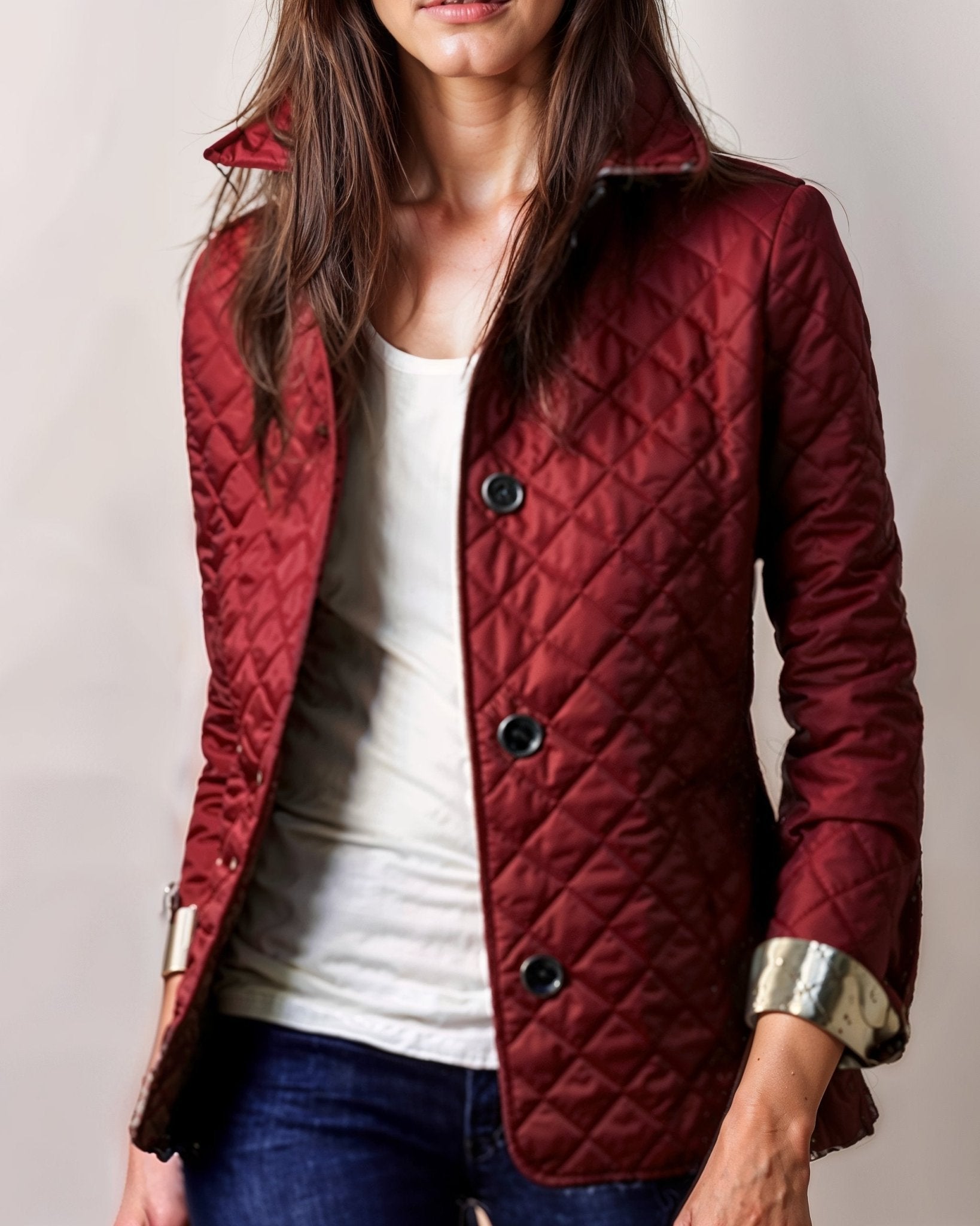 Style Details: Diamond quilted design, button-front closure, and classic collar