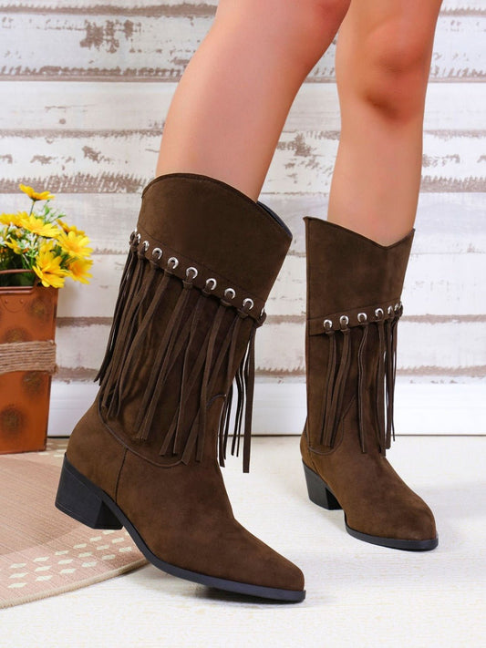 Western Fringe Mid-Calf Boots | Faux Suede | Studded Details | Boho Chic Footwear