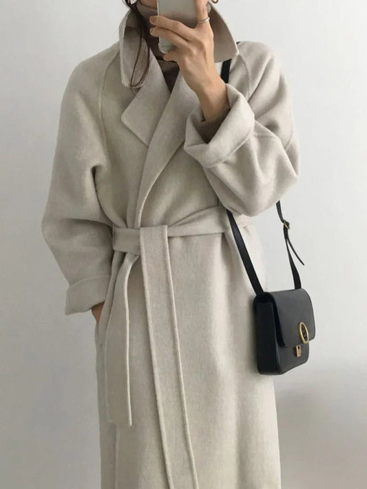 Women's Longline Wool Blend Coat | Belted Wrap Design | Minimalist Outerwear